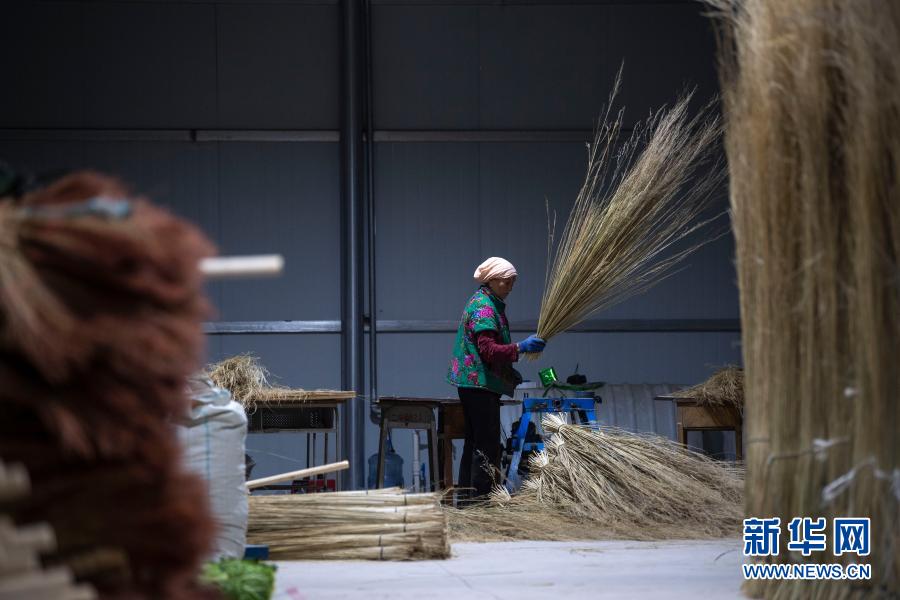 工人下班后,李耀梅一个人还在扎扫帚(10月26日摄)。新华社记者 冯开华 摄