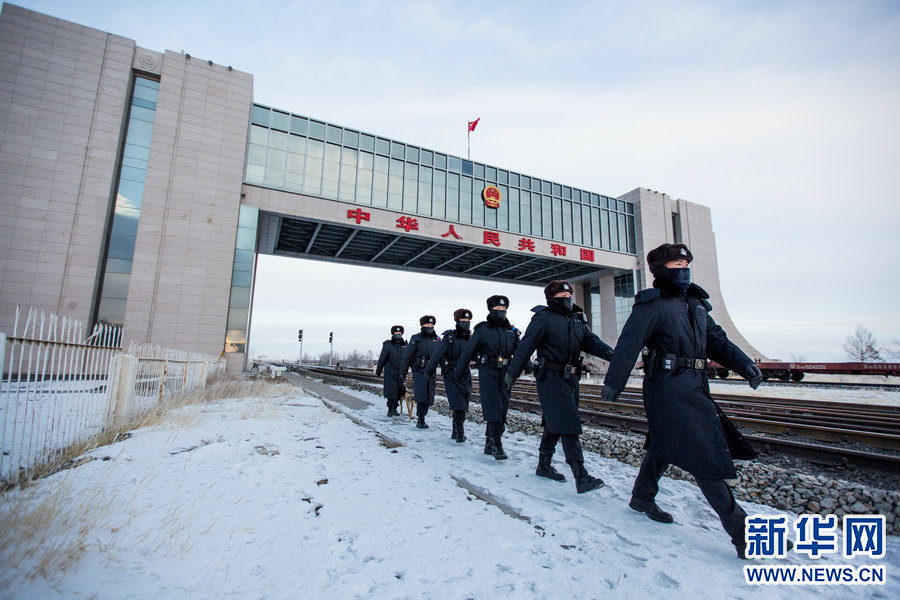 12月28日,二连出入境边防检查站民警在国门一线执勤巡逻。新华网发(郭鹏杰 摄)