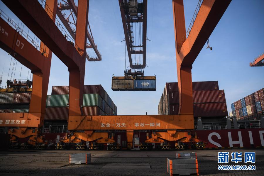 12月28日,在钦州港码头,龙门吊正在向海轮吊运集装箱。