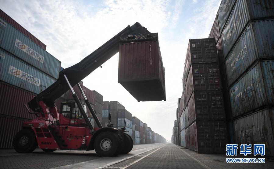 12月28日,一辆吊车在钦州港码头集装箱存放地吊运集装箱。