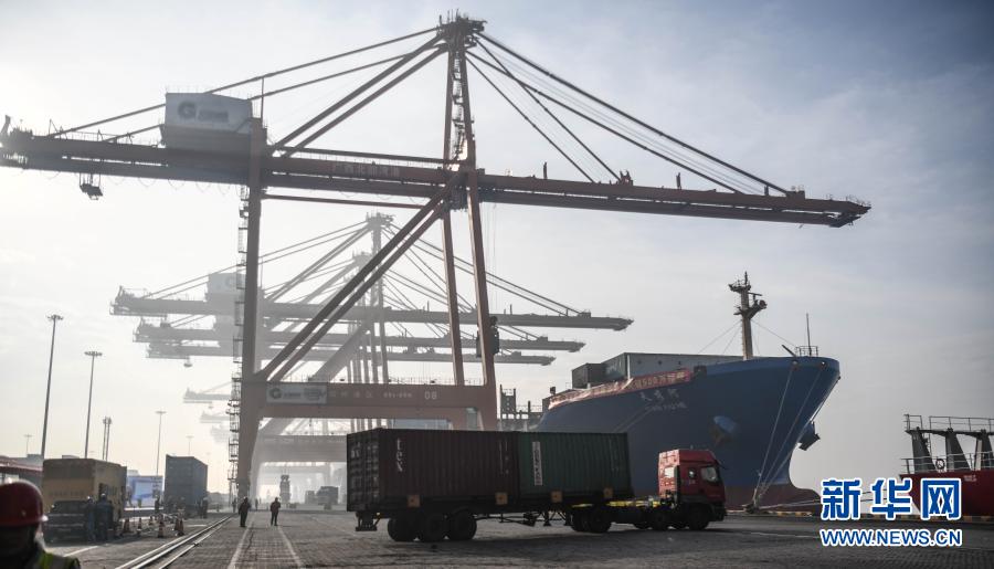晨曦中的钦州港码头,车辆正在中转集装箱(12月28日摄)。