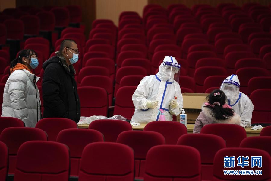 12月28日,在北京市顺义区北小营镇前鲁各庄村核酸采样点,医护人员(右一)在进行核酸采样。