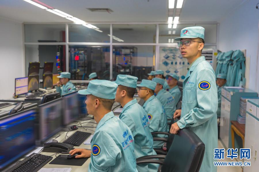 酒泉卫星发射中心指挥显示操控组组员在执行试验六号02星任务,组长曾显华(右一)密切关注图像的显示状态(7月5日摄)。新华社发(杨智健 摄)