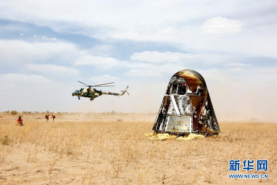 新一代载人飞船试验船返回舱返回东风着陆场,酒泉卫星发射中心空中搜救队员抵达现场进行通信设备架设(5月8日摄)。新华社发(董延荣 摄)