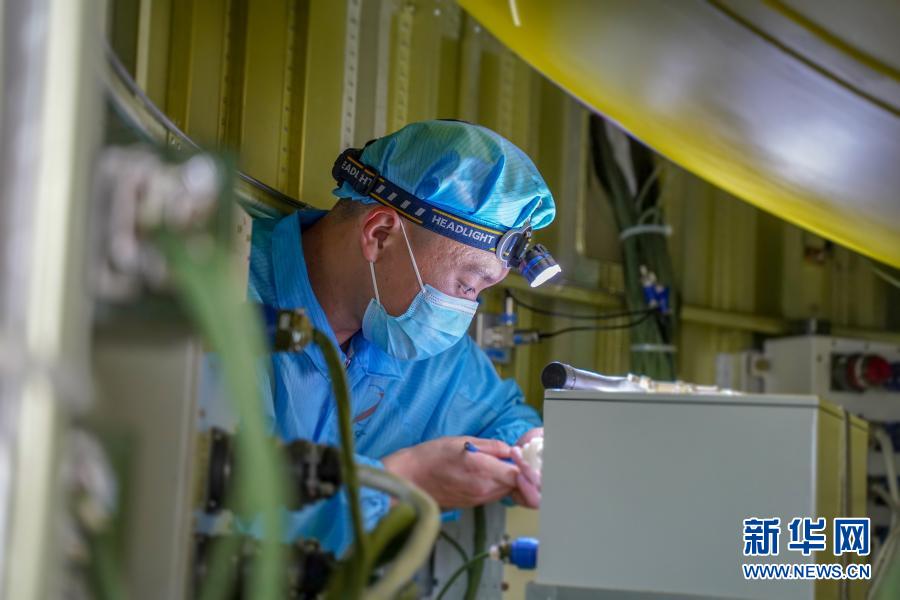 酒泉卫星发射中心工作人员给箭体安装电池(5月30日摄)。新华社发(姚军鹏 摄)