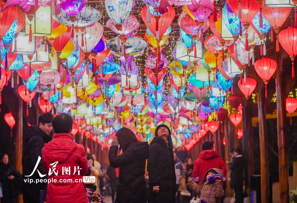 2020年12月27日,重庆市荣昌区夏布小镇,璀璨夺目的灯饰吸引了市民前来游玩。龙帆摄 (人民图片网)