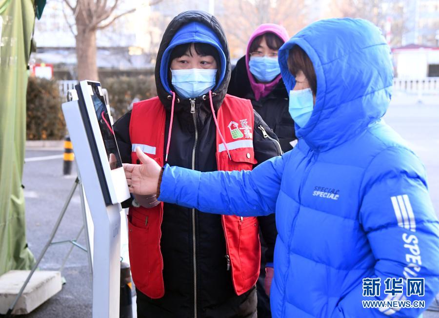 12月29日,在北京市顺义区旺泉街道宏城花园社区出入口,社区工作人员(左)指导居民测量体温。新华社记者 任超 摄