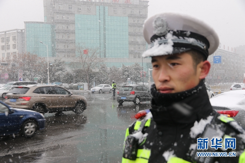 12月29日,枣庄市高新区交警大队民警冒雪在路面执勤。