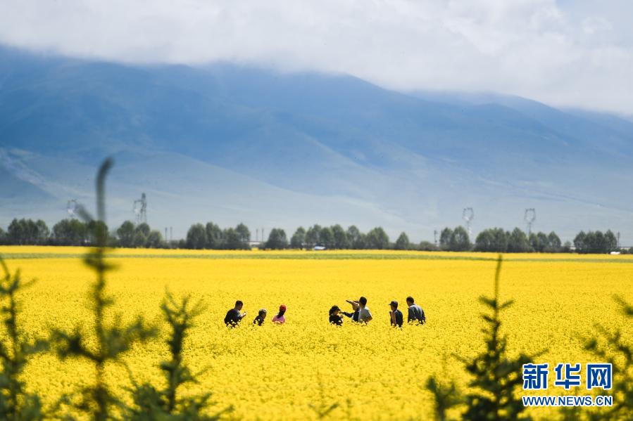 7月22日,游客在青海门源回族自治县的油菜花田中拍照。