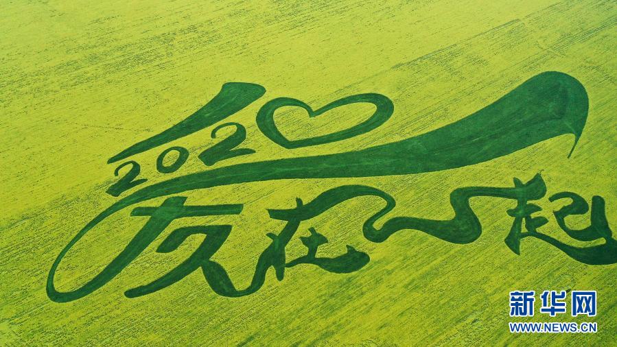 这是7月23日拍摄的青海门源回族自治县的油菜花田拼出的“2020爱在一起”的图案(无人机照片)。