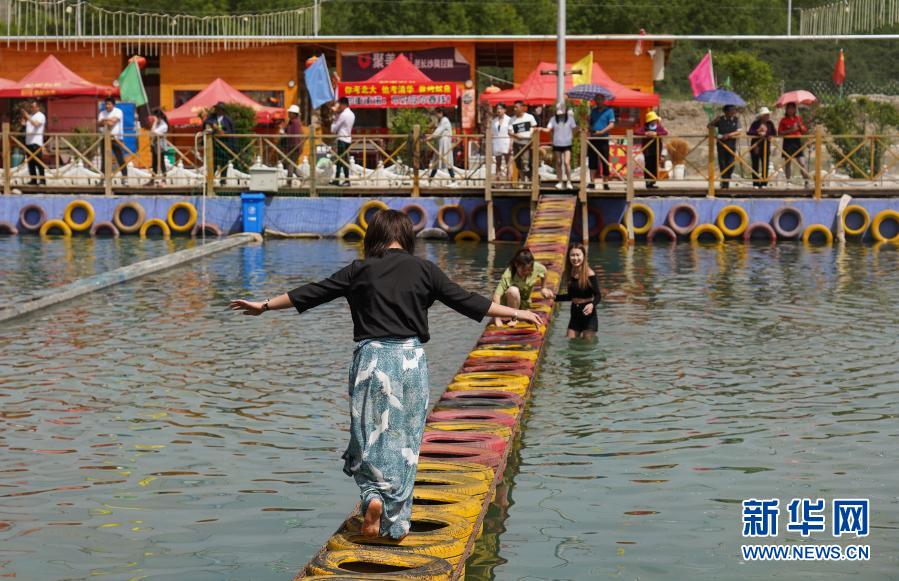 6月9日,游客在青海卓扎滩原生态景区的水上吊桥项目玩耍。