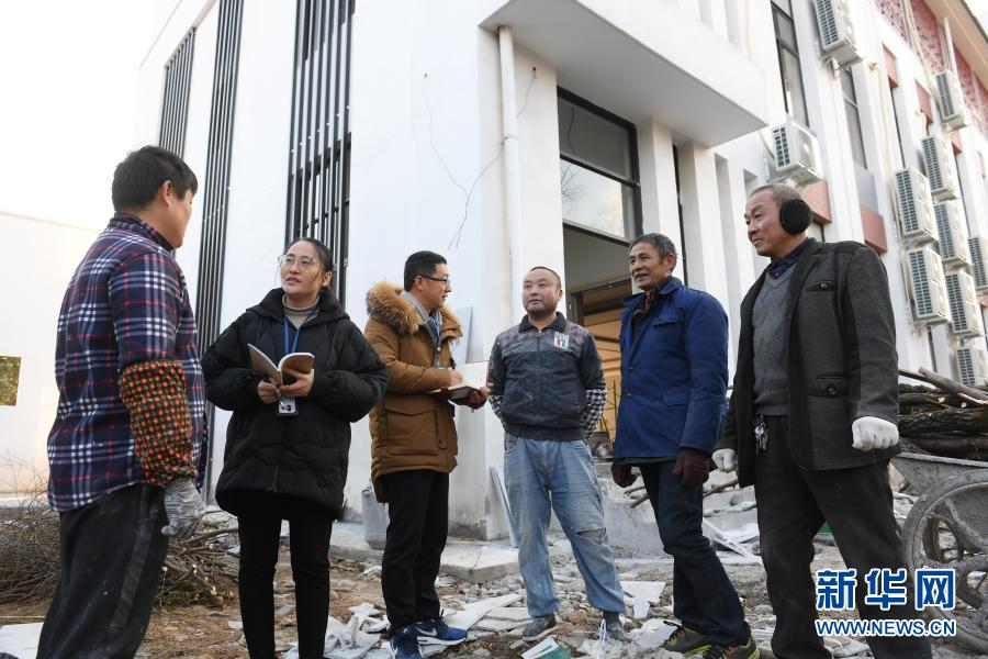 12月30日,纪检监察干部(左二、左三)在山背村文化礼堂建设工地向务工人员了解职能部门是否做好农民工工资支付的各项工作。