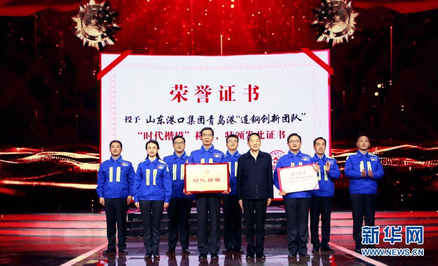 山东港口集团青岛港“连钢创新团队”在“时代楷模”发布仪式上领取奖章和证书(12月25日摄)。