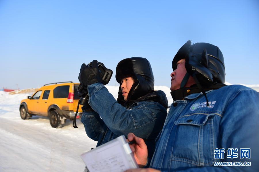 12月30日,国网乌鲁木齐供电公司输电运检中心运维三班巡线员张彦哲(左)、张厅喜在巡线途中进行红外测温。