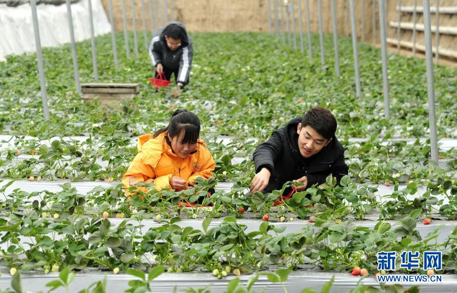 12月30日,游客在河北省河间市一家现代农业园区体验草莓采摘。
