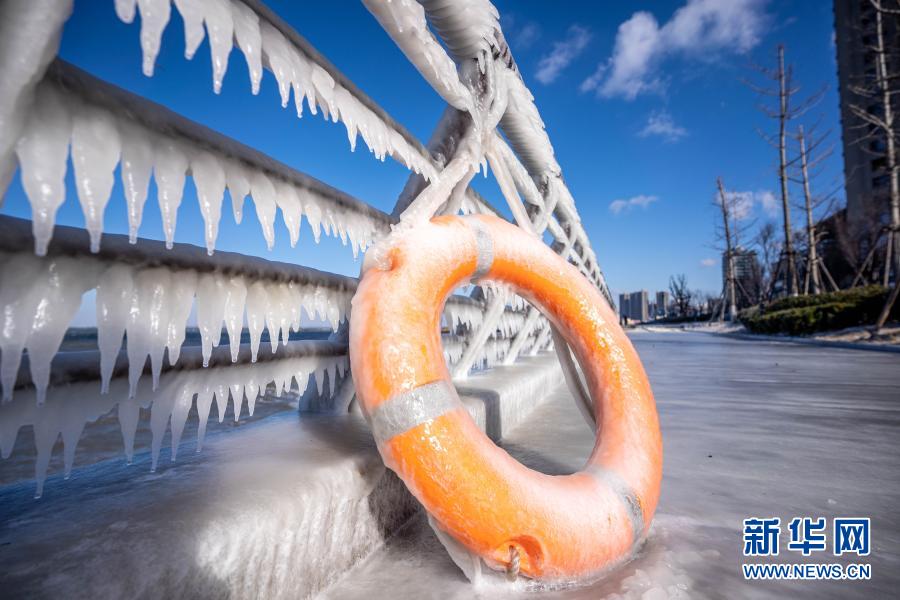 当日,青岛市最低气温探至零下11℃,胶州湾东岸海边植被、护栏、雕塑等被冰封。