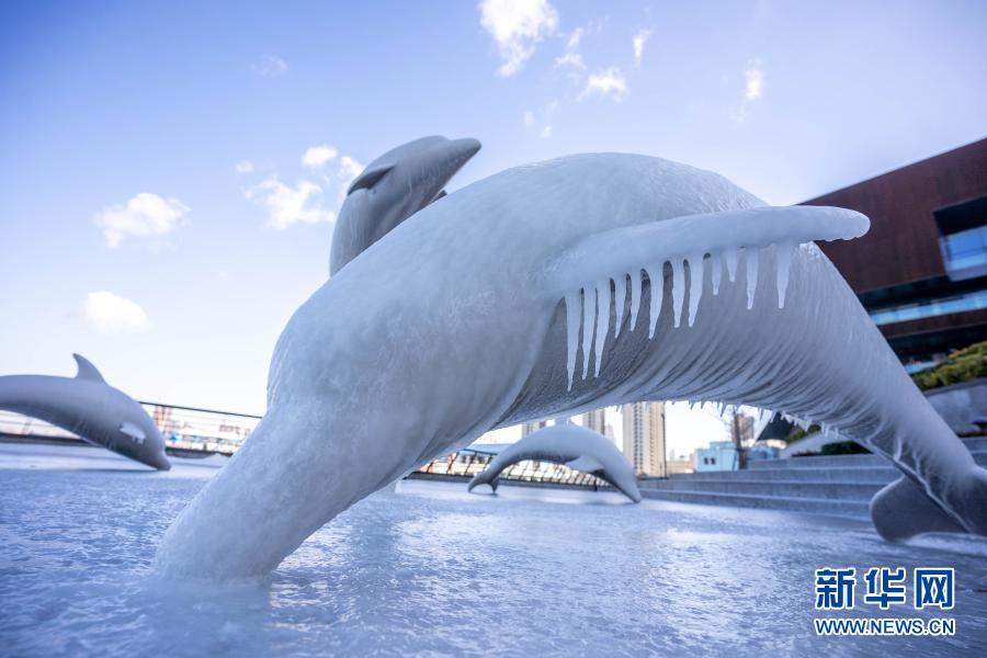 12月30日,青岛胶州湾东岸海边的海豚雕塑结冰。