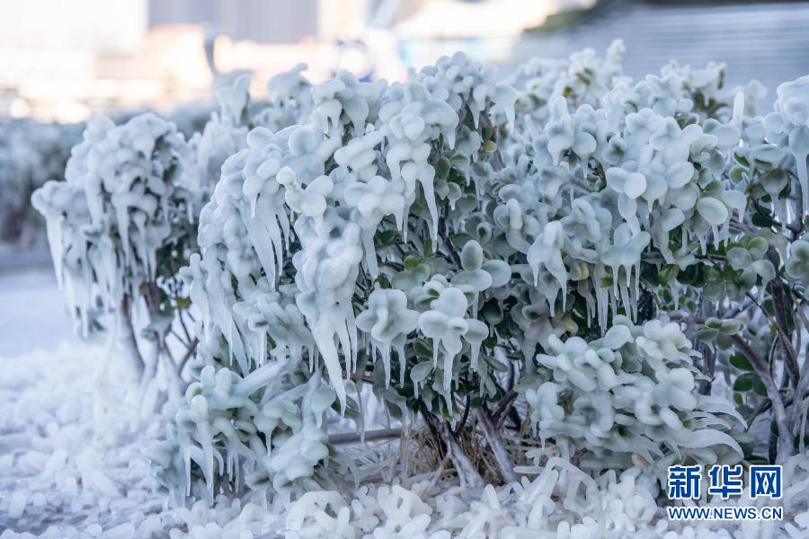 当日,青岛市最低气温探至零下11℃,胶州湾东岸海边植被、护栏、雕塑等被冰封。