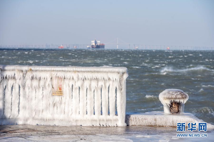 当日,青岛市最低气温探至零下11℃,胶州湾东岸海边植被、护栏、雕塑等被冰封。