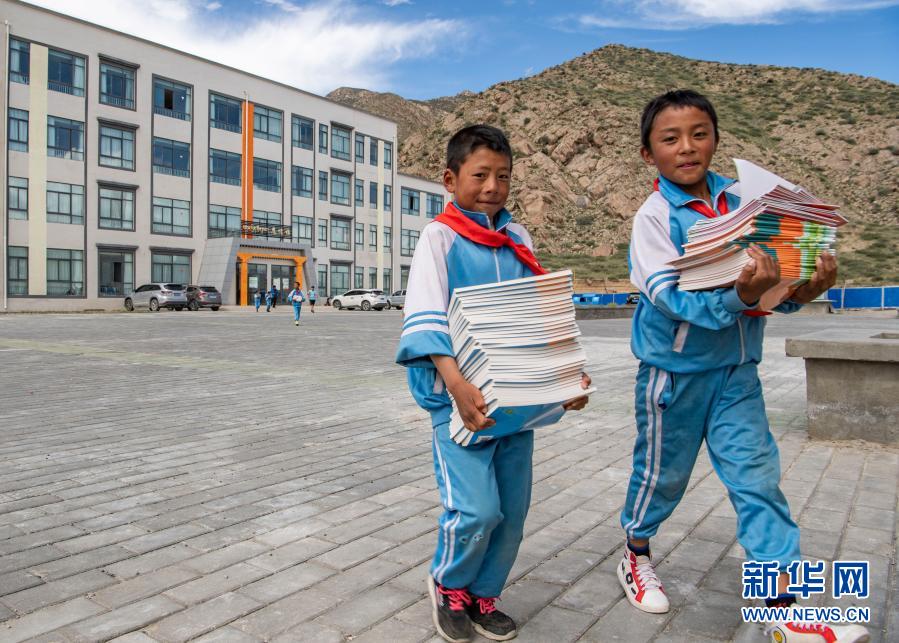 在山南市贡嘎县森布日幸福家园九年一贯制学校,刚开学的孩子们搬新书(8月24日摄)。新华社记者 孙非 摄