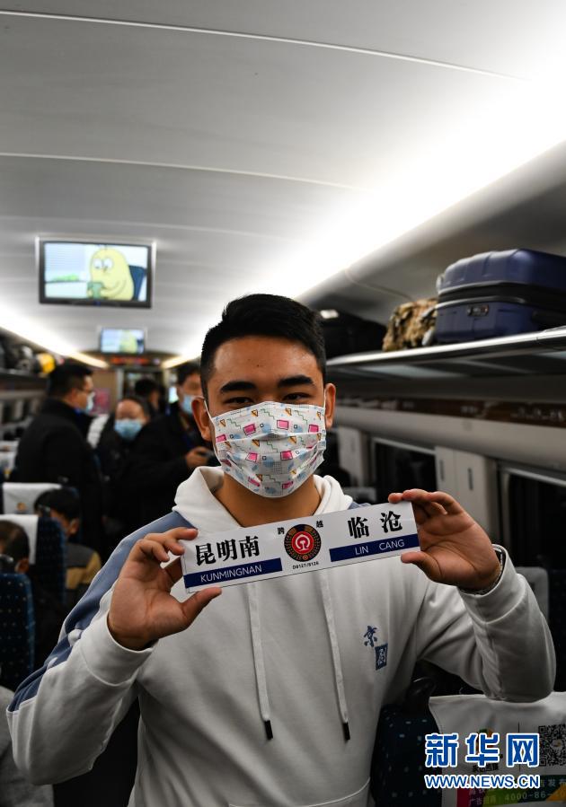 12月30日,一名乘客在昆明南至临沧的D8127次列车上手持自制纪念品留影。