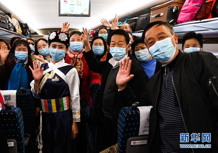 12月30日,身穿少数民族服饰的乘务人员在昆明南至临沧的D8127次列车上与乘客合影。