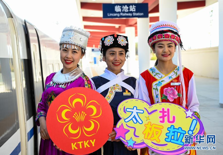 12月30日,乘务人员身穿少数民族服饰在铁路临沧站持标语合影。