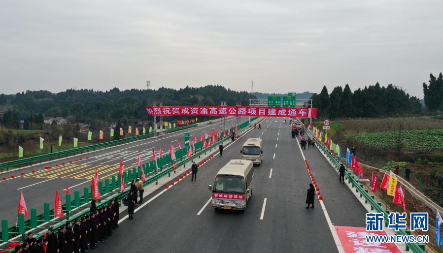 12月30日,在四川省资阳市雁江区,参加撞彩仪式的车辆驶过成资渝高速公路路面。