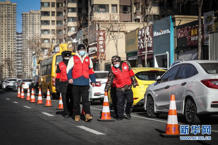 12月29日,志愿者在沈阳市于洪区橡树湾小区二期周边进行巡查。新华社记者 潘昱龙 摄