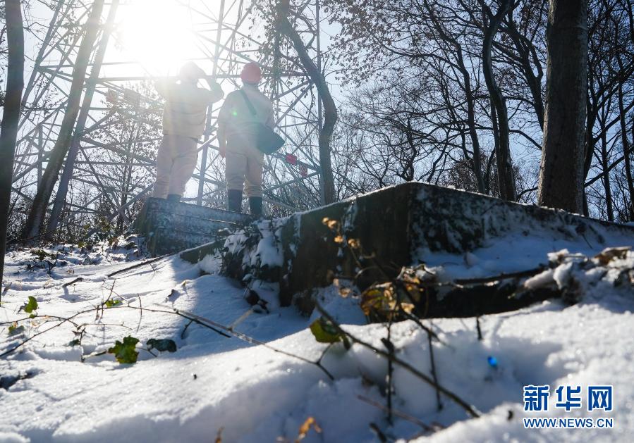 12月30日,电力工人对南京老山一处输电线路进行巡视。