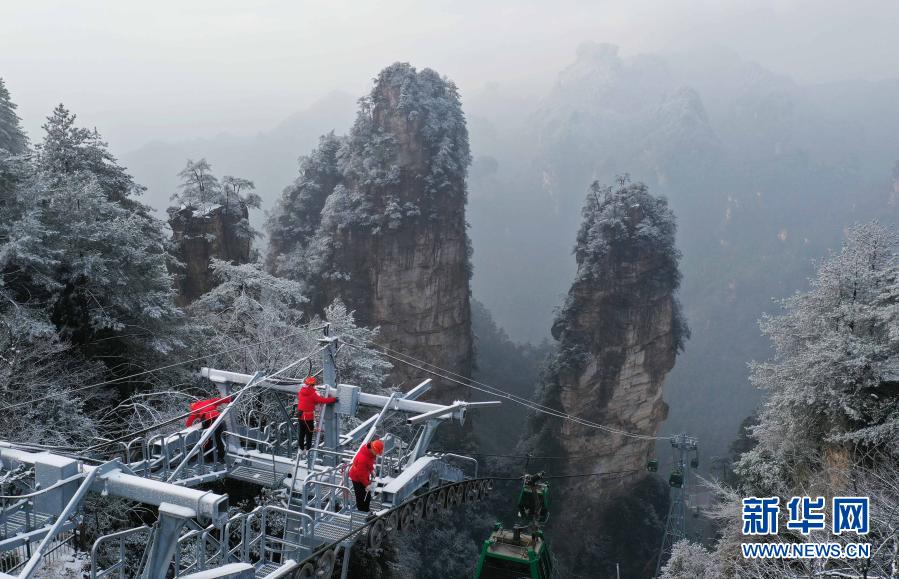 受寒潮影响,湖南张家界市武陵源区高海拔山区出现低温降雪天气。当地景区管理部门采取多种措施做好防范应对工作,加强对高空索道等游览设施的安全检查和维护,排除因低温冰雪天气带来的安全隐患,确保游客安全。