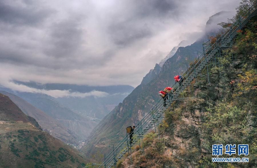 某色苏不惹(右二)和同伴背着“双十一”采购的货物回村(2019年11月16日摄,无人机照片)。新华社记者 江宏景 摄