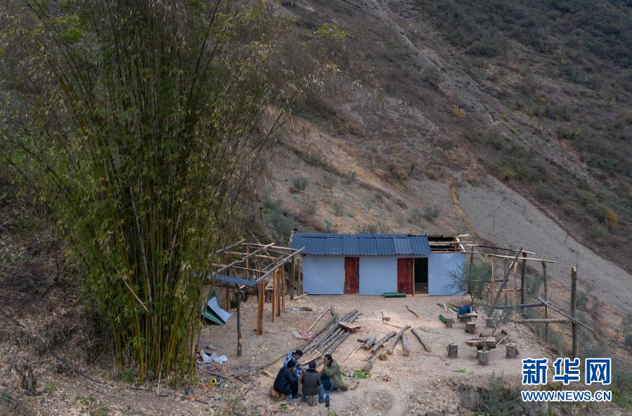 12月23日,某色苏不惹和同伴在悬崖村修民宿(无人机照片)。新华社记者 江宏景 摄