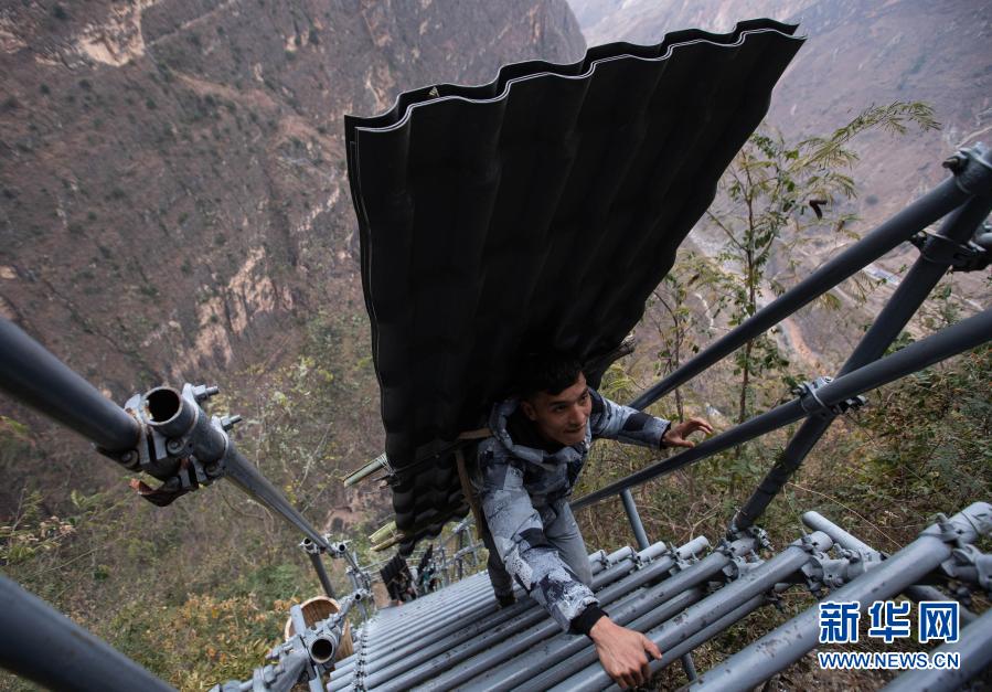 12月23日,某色苏不惹背着修民宿的建材攀爬钢梯。新华社记者 江宏景 摄