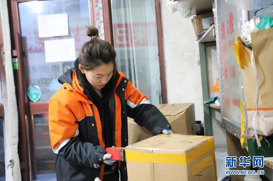 在黑龙江省漠河市,快递员吕慧在打包快递(12月29日摄)。新华社记者 孙晓宇 摄