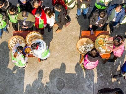 冬季农闲,湖北省秭归县九畹溪镇组织当地农民参加挑水、拔河、搓玉米、包饺子等丰富多彩的活动,庆祝丰收,喜迎新年。