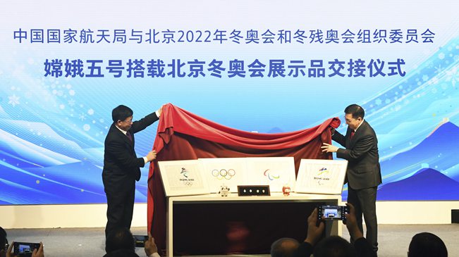 12月21日,中国国家航天局与北京2022年冬奥会和冬残奥会组织委员会嫦娥五号搭载北京冬奥会展示品交接仪式在北京冬奥组委首钢办公区举行。