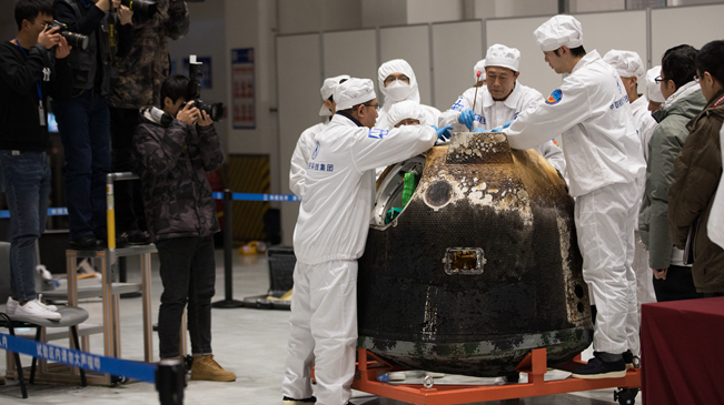 12月17日,在中国航天科技集团五院,科研人员打开嫦娥五号返回器舱门,取出装有月球样品的容器并进行称重。