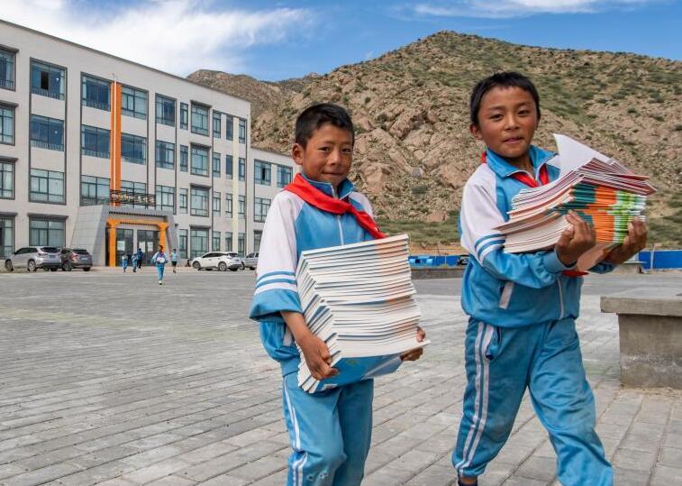 在山南市贡嘎县森布日幸福家园九年一贯制学校,刚开学的孩子们搬新书(8月24日摄)。