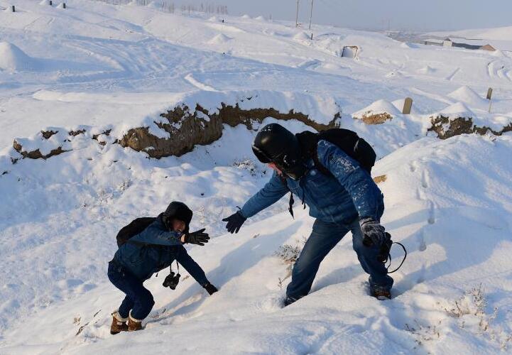 12月30日,国网乌鲁木齐供电公司输电运检中心运维三班巡线员张彦哲(左)、张厅喜在巡线途中。