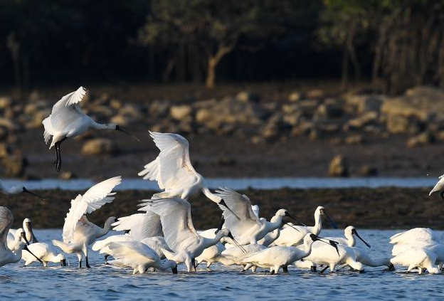 近日,不少黑脸琵鹭飞临位于海南儋州市光村镇的海南新盈红树林国家湿地公园越冬。黑脸琵鹭在湿地公园飞翔、嬉戏,成为冬日里一道独特风景。