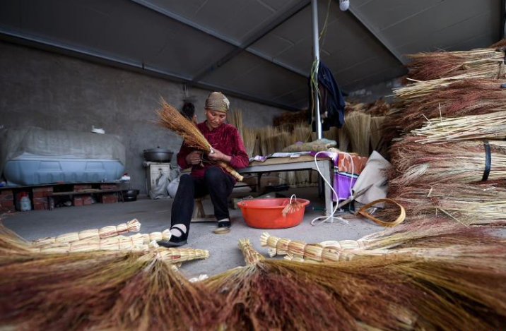 李耀梅在自家院子里建起了简易的扫帚车间。这是她在扎笤帚(2019年4月28日摄)。