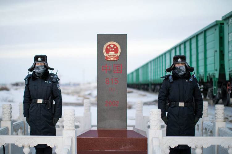 12月28日,二连出入境边防检查站民警在中蒙边境815号界碑前执勤,民警呼出的雾气凝结成冰霜挂在帽子和防寒面罩上。