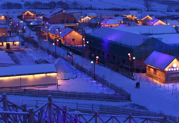 这是12月25日拍摄的塔拉特村景色。新疆阿勒泰地区富蕴县可可托海镇塔拉特村位于额尔齐斯河源头附近,被誉为“额河第一村”。冬季夜幕中的塔拉特村,在灯光的映衬下如同冰雪童话世界。