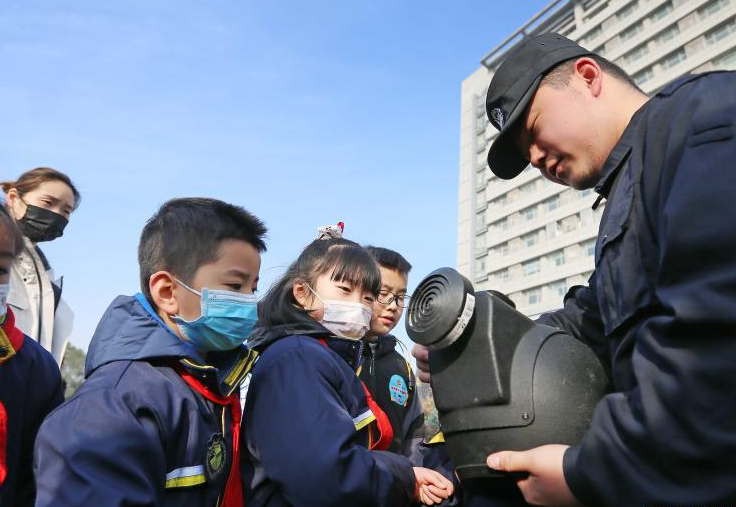 12月26日,淮北市的小朋友在参观警用排爆头盔。当日,安徽省淮北市公安局举行警营开放日活动,邀请市民走进警营参观互动,活动内容包括警务装备展示、警务技能现场演练、安全防范知识宣传和趣味知识竞答等。
