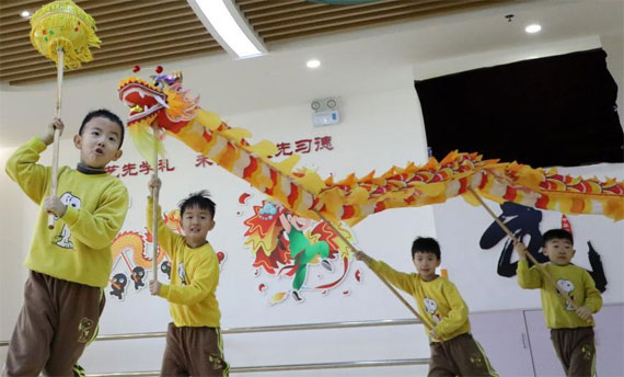 12月25日,幼儿园小朋友在练习舞龙。当日,山东省滨州市博兴县一家幼儿园开展“舞龙迎新年”活动,小朋友在专业老师带领下学习传统舞龙,迎接新年的到来。