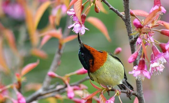 12月22日,在贵阳市花溪国家城市湿地公园里,枝头的冬樱花吸引叉尾太阳鸟前来觅食啄花。