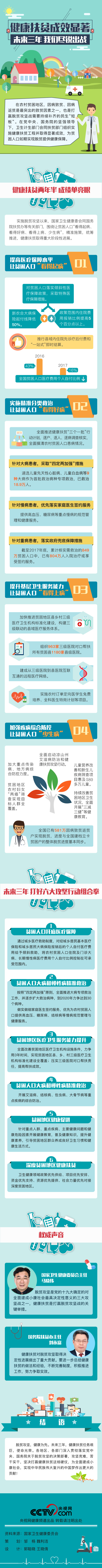 央视网消息:在农村贫困地区,因病致贫、因病返贫是最突出的致贫因素之一,也是打赢脱贫攻坚战需要持续补齐的民生“短板”。在党中央、国务院的坚强领导下,国家卫生健康委会同国务院扶贫办等有关部门,围绕让贫困人口“看得起病、看得好病、看得上病、少生病”,精准施策,统筹推进,健康扶贫取得重大阶段性进展。未来三年,我国将实施健康扶贫六大攻坚行动,为贫困人口如期实现脱贫提供健康保障。