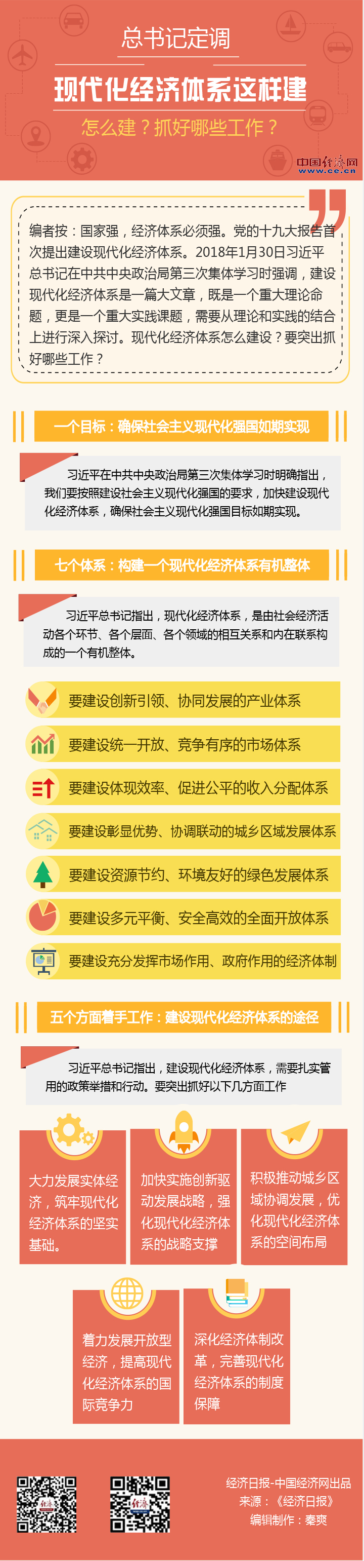 编者按:国家强,经济体系必须强。党的十九大报告首次提出建设现代化经济体系。2018年1月30日,习近平总书记在中共中央政治局第三次集体学习时强调,建设现代化经济体系是一篇大文章,既是一个重大理论命题,更是一个重大实践课题,需要从理论和实践的结合上进行深入探讨。现代化经济体系怎么建设?要突出抓好哪些工作?