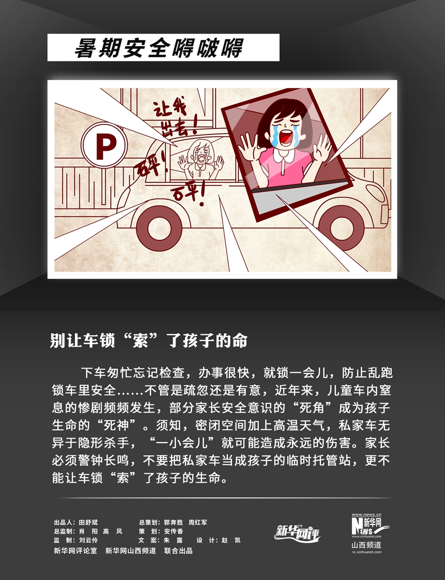 下车匆忙忘记检查,办事很快,就锁一会儿,防止乱跑锁车里安全……不管是疏忽还是有意,近年来,儿童车内窒息的惨剧频频发生,部分家长安全意识的“死角”成为孩子生命的“死神”。须知,密闭空间加上高温天气,私家车无异于隐形杀手,“一小会儿”就可能造成永远的伤害。家长必须警钟长鸣,不要把私家车当成孩子的临时托管站,更不能让车锁“索”了孩子的生命。(朱露)